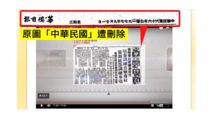 其中提到 “音樂事務處宣傳片也有用到《華僑日報》當年的剪報,但同樣被刪走印有「中華民國」的報眉(紅框示)。” 驟眼看,直接的認知是,一如展板,宣傳片刪去中華民國年曆而只顯示公曆日期。再看配圖中“原圖「中華民國」遭刪除“的說明字,亦只提到中華民國被刪。